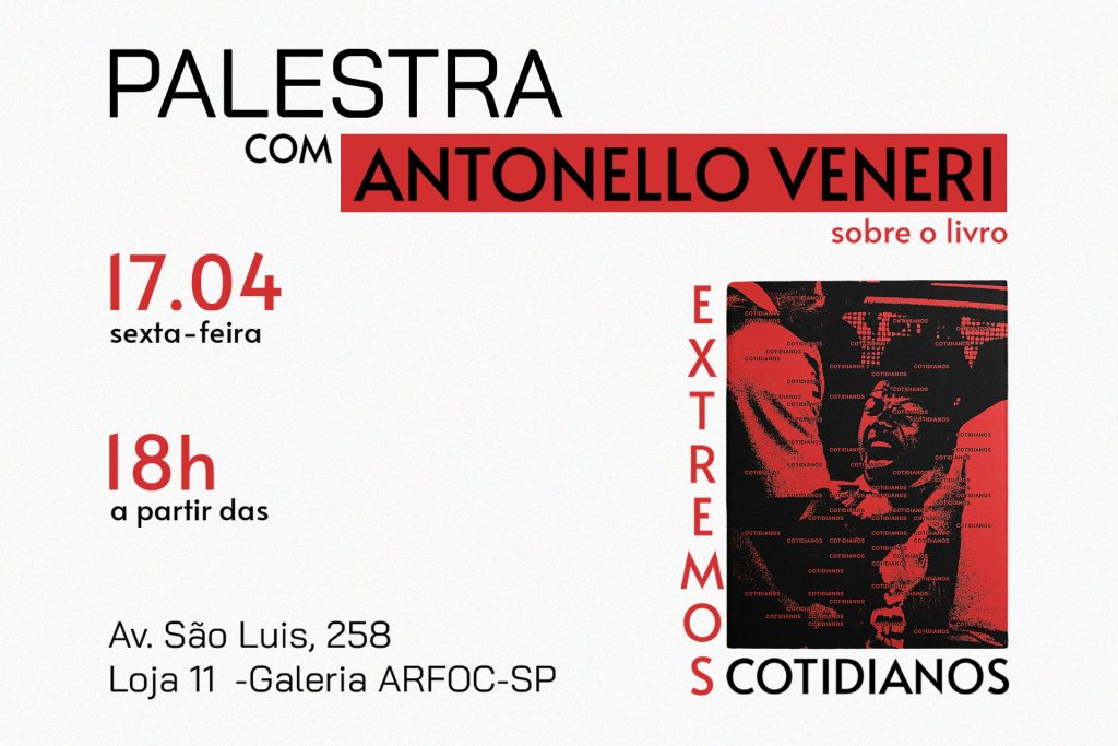 A Galeria ARFOC-SP convida associados, estudantes e entusiastas da fotografia para a palestra com o fotógrafo e jornalista italiano Antonello Veneri, que ocorrerá no dia 17 de abril (sexta-feira), às 18h. O encontro terá como tema central sua obra mais recente, “Extremos Cotidianos”, um mergulho visual nas contradições e belezas do Brasil atual.
